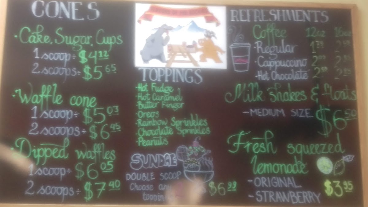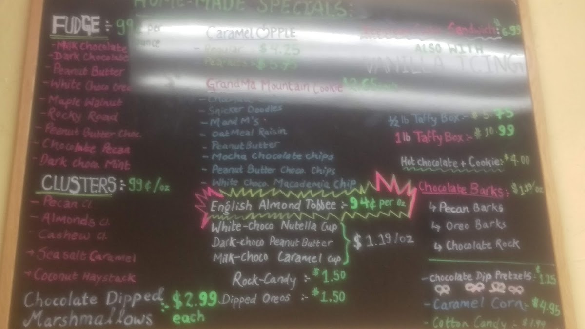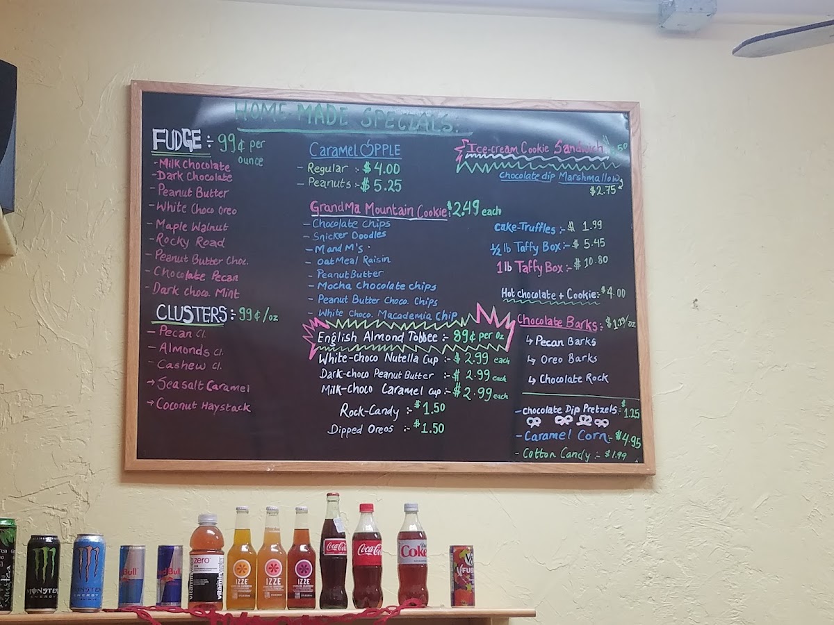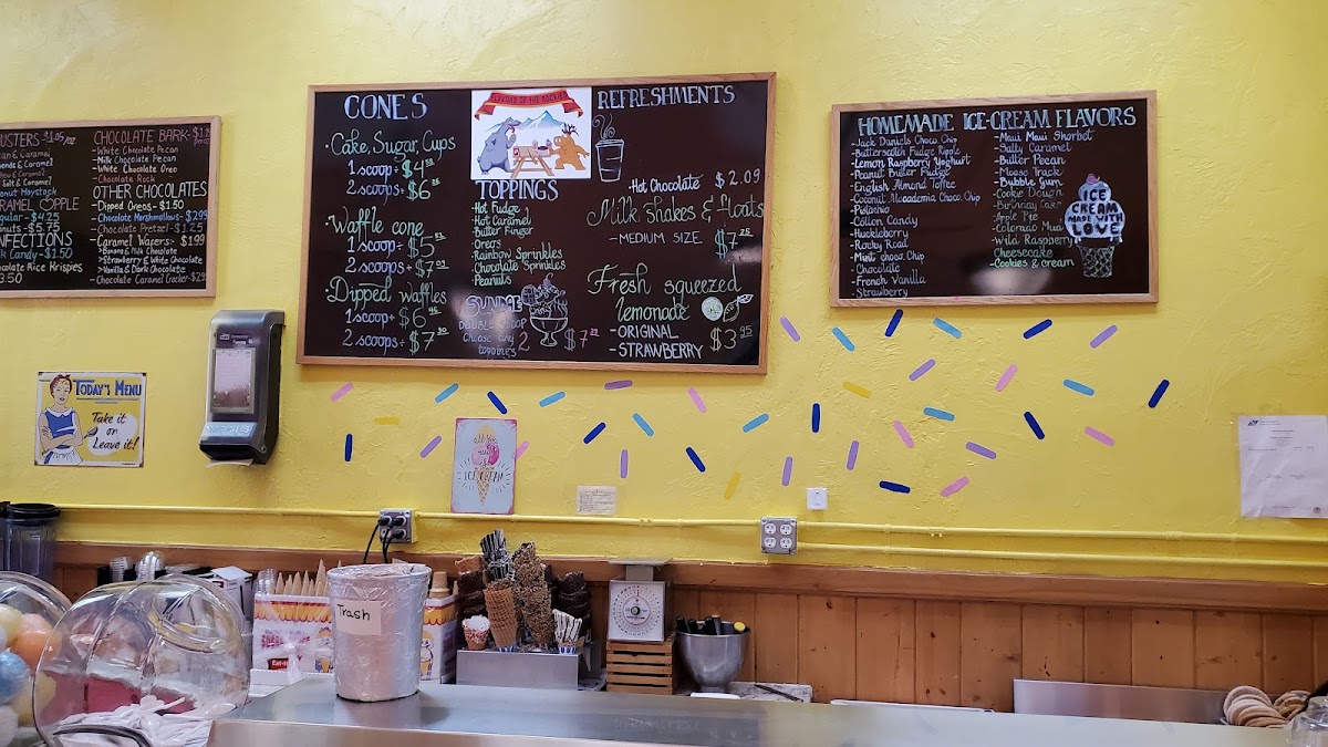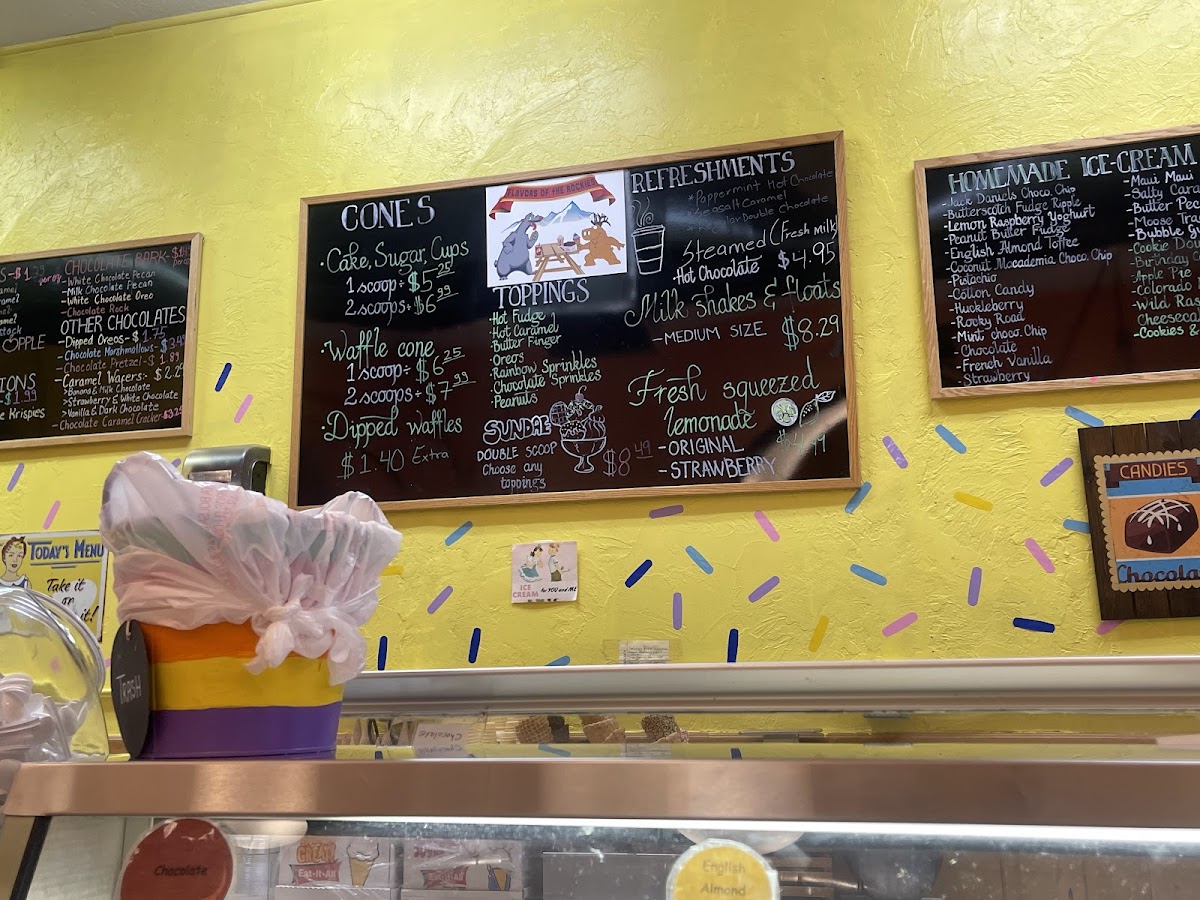 As a reviewer summing up the menu at Flavors Of The Rockies, what stands out is the playful mix of nostalgic sweets and rich frozen treats that promise something for every craving: from Dipped Oreos, Chocolate Pretzel, and Vanilla & Dark Chocolate Chocolate Caramel Cracker in the chocolates section to creamy scoops like Butterscotch Fudge Ripple, Lemon Raspberry Yoghurt, English Almond Toffee Pistachio, and Huckleberry in the homemade ice‑cream lineup. The “Other Sweets” category dazzles with classics such as Cinnamon Chewies, Sour Balls, Caramel Corn, Caramel Corn W/ Peanuts, and Cotton Candy, while the cones list features indulgent Dipped Waffles. On the beverage side, simple comforts like Coffee, Regular Cappuccino, and Hot Chocolate round out the experience. For cookie lovers, the “Others” selection delivers with Snickerdoodle, Oatmeal Raisin, Mocha Chocolate Chips Peanut Butter & Chocolate Chips, and White Chocolate & Macadamia Chips - all presented without listed prices but with unmistakable appeal that reflects the shop’s focus on fun, flavorful menu staples.
